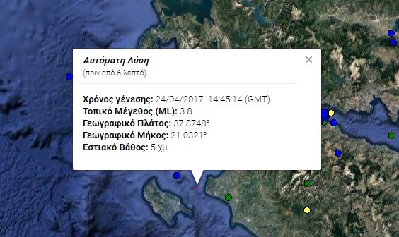 3,8 ΡΙΧΤΕΡ Σεισμική δόνηση μεγέθους 3,8 βαθμών της κλίμακας Ρίχτερ σημειώθηκε λίγο πριν τις 6 σήμερα το απόγευμα στη θαλάσσια περιοχή μεταξύ Ζακύνθου και Ηλείας. Σύμφωνα με το Γεωδυναμικό Ινστιτούτο Αθηνών το εστιακό βάθος ήταν μόλις 5 χλμ για αυτό και έγινε αισθητή στην Πάτρα, το Αγρίνιο και στις γύρω περιοχές. tempo24.gr Τροποποίηση προγράμματος “Εξοικονόμηση κατ’…