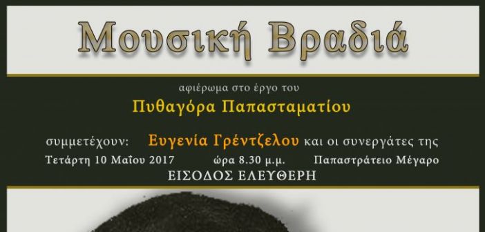 Η Σχολή Τοπικής Ιστορίας και Πολιτισμού «Αθανάσιος Παλιούρας», που λειτουργεί το Τμήμα Πνευματικών και Καλλιτεχνικών Εκδηλώσεων της Γυμναστικής Εταιρείας Αγρινίου διοργανώνει: Μουσική βραδιά – αφιέρωμα στο έργο του Αγρινιώτη στιχουργού Πυθαγόρα Παπασταματίου, με την Ευγενία Γρέντζελου και τους συνεργάτες της, την Τετάρτη 10 Μαΐου 2017, στις 8.30 μ.μ. στο Παπαστράτειο Μέγαρο, με ελεύθερη είσοδο. Εκδρομή…