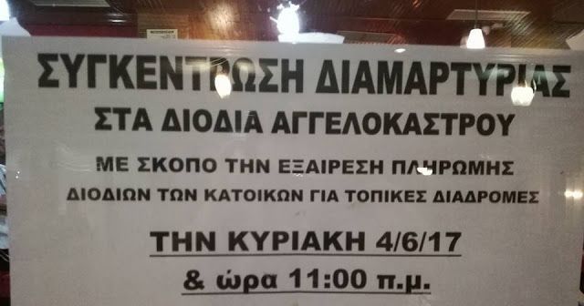 Συγκέντρωση διαμαρτυρίας θα πραγματοποιήσουν την Κυριακή 4.6.2017 και ώρα 11:00 το πρωί, οι κάτοικοι από τα χωριά Παλαιομάνινα, Ρίγανη, Στρογγυλοβούνι, Γουριώτισσα, στα διόδια Αγγελοκάστρου, με σκοπό την εξαίρεση πληρωμής διοδίων των μονίμων κατοίκων για τοπικές διαδρομές. Οι πρόεδροι των κατοίκων των εν λόγω χωριών είχαν παραδώσει πριν λίγες μέρες και υπόμνημα στον Υπουργό Υποδομών και Μεταφορών…
