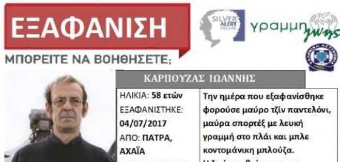 Για 16η ημέρα αγνοούνται τα ίχνη του Πατρινού Ιωάννη Καρμπουζά 58 ετών, με την αγωνία των οικείων του να κορυφώνεται, εκφράζοντας φόβους για την ζωή του. Ο άνδρας εξαφανίστηκε στις 4 Ιουλίου και από εκείνη την ημέρα δεν έχει δώσει κανένα σημάδι ζωής. Για τον εντοπισμό του, ενεργοποιήθηκε η γραμμή αναζήτησης «Silver Alert», μετά από εισαγγελική…