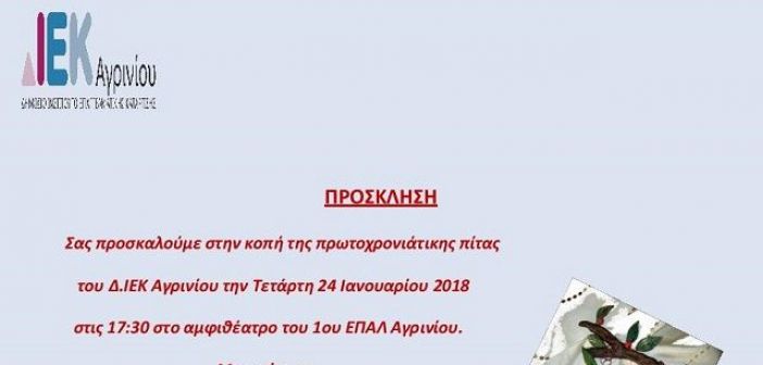 Το Δημόσιο ΙΕΚ Αγρινίου καλεί στην κοπή της πρωτοχρονιάτικης πίτας την Τετάρτη 24 Ιανουαρίου στις 17:30 στο αμφιθέατρο του 1ου ΕΠΑΛ Αγρινίου. Ενημέρωση για τους κινδύνους του Διαδικτύου – «Ψάχνοντας την ερμηνεία» …