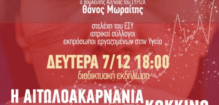 O ΣΥΡΙΖΑ Αιτωλοακαρνανίας διοργανώνει διαδικτυακή εκδήλωση με θέμα: “η Αιτωλοακαρνανία στο “κόκκινο” – Η πραγματική εικόνα και οι ευθύνες”. Ομιλητές είναι ο πρ. Υπουργός Υγείας και τομεάρχης Υγείας και ο βουλευτής Αιτωλοακαρνανίας και Αναπληρωτής τομεάρχης Υγείας…