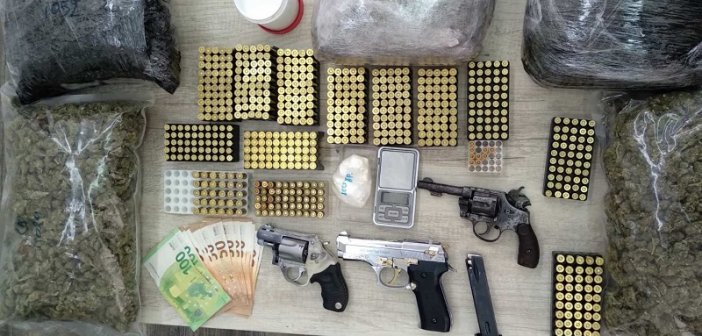 Κατασχέθηκαν περισσότερα από πέντε κιλά κάνναβης, 100 γραμμάρια κοκαΐνης, δύο περίστροφα, ένα πιστόλι replica και περισσότερα από 600 φυσίγγια. Κακουργηματικού χαρακτήρα δικογραφία για διακίνηση και κατοχή ναρκωτικών, καθώς και παράβαση του νόμου για τα όπλα…