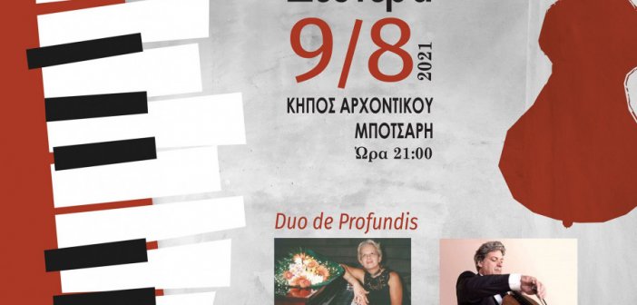 Στο πλαίσιο των Πολιτιστικών Εκδηλώσεων για το Καλοκαίρι 2021, ο Δήμος Ναυπακτίας παρουσιάζει το μουσικό σχήμα Duo de Profundis σε μια βραδιά σύγχρονης και jazz μουσικής στον Κήπο του Αρχοντικού Μπότσαρη, τη Δευτέρα, 9 Αυγούστου…