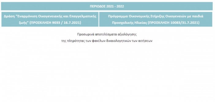 Αναρτήθηκαν το απόγευμα της Παρασκευής 13/8 τα προσωρινά αποτελέσματα της ΕΕΤΑΑ για τους παιδικούς σταθμούς ΕΣΠΑ και θα ακολουθήσουν οι ενστάσεις από τους ενδιαφερόμενους. Τα προσωρινά αποτελέσματα του προγράμματος «Εναρμόνιση Οικογενειακής και Επαγγελματικής Ζωής» 2021-2022 και το…