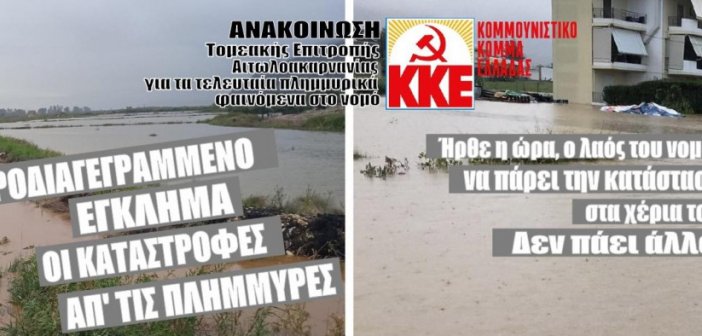 Συνεχίστε την ανάγνωση του άρθρου: ΚΚΕ Τ.Ο. Αιτωλοακαρνανίας: “Προδιαγεγραμμένο έγκλημα οι καταστροφές από τις πλημμύρες”