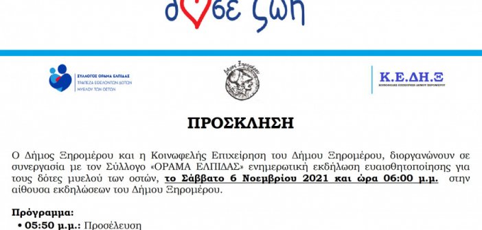 Ο Δήμος Ξηρομέρου και η Κοινωφελής Επιχείρηση του Δήμου Ξηρομέρου, διοργανώνουν σε συνεργασία με τον Σύλλογο «ΟΡΑΜΑ ΕΛΠΙΔΑΣ», ενημερωτική εκδήλωση ευαισθητοποίησης για τους δότες μυελού των οστών. Το Σωματείο Σύλλογος «ΟΡΑΜΑ ΕΛΠΙΔΑΣ» είναι μη κερδοσκοπικός οργανισμός….