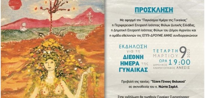 Με αφορμή τη Διεθνή Ημέρα της Γυναίκας συνδιοργανώνεται στο Αγρίνιο εκδήλωση την Τετάρτη 9 Μαρτίου στο Δημοτικό Κινηματογράφο “Άνεσις”….