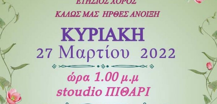 Ο Πολιτιστικός Σύλλογος Ρουμελιώτες μαζί με το Καλλιτεχνοχώρι διοργανώνουν και σας προσκαλούν στον ετήσιο χορό << ΚΑΛΩΣ ΜΑΣ ΗΡΘΕΣ ΑΝΟΙΞΗ >> που θα πραγματοποιηθεί στις 27 Μαρτίου 2022 και ώρα 1 μ. μ. στο stoudio Πιθάρι , Ηρακλείτου, Αγρίνιο…