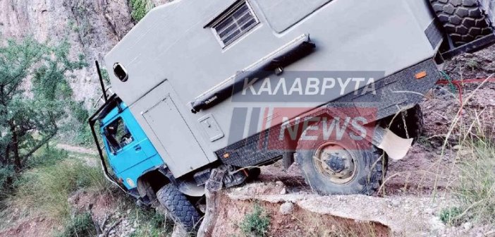 Σαν από θαύμα σώθηκαν τέσσερις Γερμανοί τουρίστες με το βαρύ όχημά τους να κρέμεται έτοιμο να πέσει σε χαράδρα στο “δρόμο” από Ιερά Μονή Μακελλαριάς Καλαβρύτων προς το χωριό Λαπαναγοί….