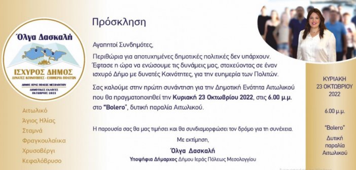 Ο ανεξάρτητος δημοτικός συνδυασμός “Ισχυρός Δήμος, Δυνατές Κοινότητες, Ευημερία Πολιτών” με επικεφαλής την κα. Όλγα Δασκαλή, πραγματοποιεί την πρώτη συνάντηση στην Δημοτική Ενότητα Αιτωλικού, την Κυριακή 23 Οκτωβρίου…