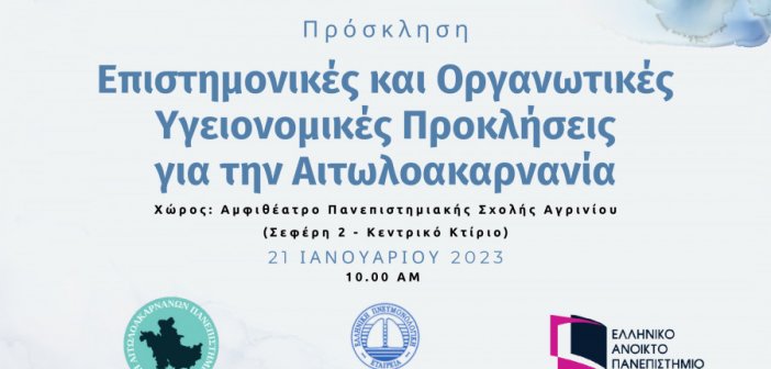 Εκδήλωση με θέμα: Επιστημονικές και Οργανωτικές Υγειονομικές Προκλήσεις για την Αιτωλοακαρνανία, θα πραγματοποιηθεί στο Αμφιθέατρο της Πανεπιστημιακής Σχολής Αγρινίου το Σάββατο 21 Ιανουαρίου ώρα 10.00 το πρωί….