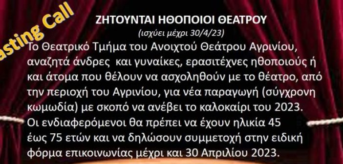 Συνεχίστε την ανάγνωση του άρθρου: Αγρίνιο: Πρόσκληση του Ανοιχτού Θεάτρου για ερασιτέχνες ηθοποιούς