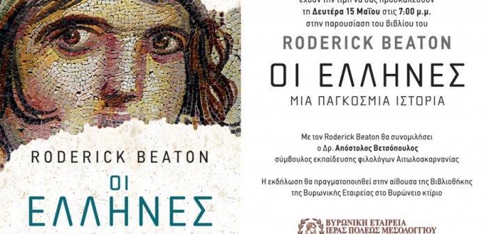 Με χαρά θα σας περιμένουμε στην παρουσίαση του βιβλίου “ΟΙ ΕΛΛΗΝΕΣ μια ΠΑΓΚΟΣΜΙΑ ΙΣΤΟΡΙΑ” του Ακαδημαϊκού RODERICK BEATON την Δευτέρα 15 Μαΐου 2023 στις 7:00 το απόγευμα στην Βιβλιοθήκη της ΒΥΡΩΝΙΚΗΣ ΕΤΑΙΡΕΙΑΣ στο ΒΥΡΩΝΕΙΟ κτήριο…