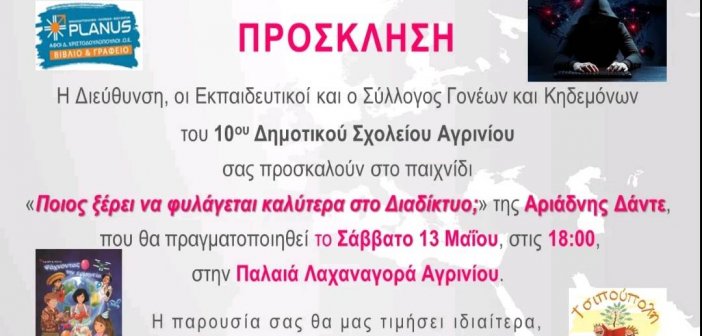 Το 10o Δημοτικό σχολείο διοργανώνει μια συνάντηση που αφορά τα παιδιά και όλους τους συμπολίτες μας και το θέμα έχει να κάνει με το διαδίκτυο και συγκεκριμένα, ένα παιχνίδι ” Ποιος ξέρει να φυλάγεται καλύτερα στο Διαδίκτυο” της Αριάδνης Δάντε….