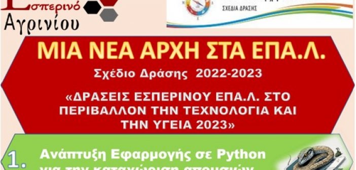 Πραγματοποιήθηκε την Τετάρτη 17 -5 –2023 η συνολική συνοπτική παρουσίαση του σχεδίου δράσης: «ΔΡΑΣΕΙΣ ΕΣΠΕΡΙΝΟΥ ΕΠΑ.Λ. ΣΤΟ ΠΕΡΙΒΑΛΛΟΝ, ΤΗΝ ΤΕΧΝΟΛΟΓΙΑ ΚΑΙ ΤΗΝ ΥΓΕΙΑ 2023»…