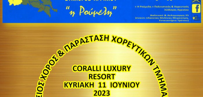 Ο Πολιτιστικός και Χορευτικός Σύλλογος Αγρινίου “Η Ρούμελη” , την Κυριακή 11 Ιουνίου στις 1 και μισή το μεσημέρι σας προσκαλεί στον ετήσιο χορό που θα πραγματοποιηθεί στο κέντρο Coralli Luxury Resort μαζί με εξαιρετική ορχήστρα…