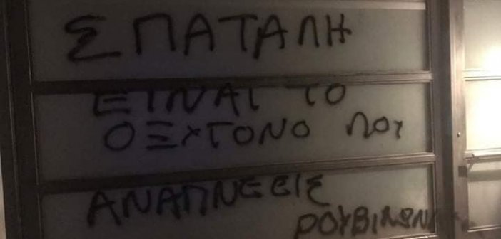 Το σύνθημα «σπατάλη είναι το οξυγόνο που αναπνέεις» έγραψαν μέλη του Ρουβίκωνα στην πόρτα του σπιτιού του Σπύρου Πνευματικού, μετά τις δηλώσεις του τελευταίου για καρκινοπαθείς….