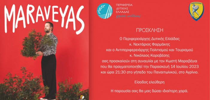 Με συναυλία του γνωστού συνθέτη και στιχουργού Κωστή Μαραβέγια, την Παρασκευή 14 Ιουλίου 2023, στο Γήπεδο του Παναιτωλικού στο Αγρίνιο, συνεχίζονται οι πολιτιστικές εκδηλώσεις που διοργανώνει η Περιφέρεια Δυτικής Ελλάδας …