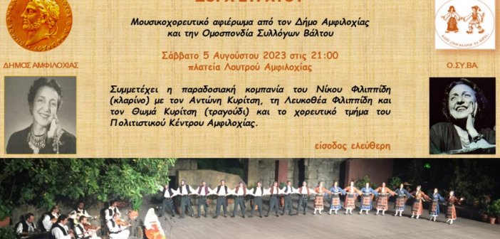 Το Σάββατο, 5 Αυγούστου 2023 στις 21:00, στην πλατεία του Λουτρού Αμφιλοχίας, θα πραγματοποιηθεί το μουσικοχορευτικό αφιέρωμα στη Δόρα Στράτου από τον Δήμο Αμφιλοχίας και την Ομοσπονδία Συλλόγων Βάλτου (Ο.ΣΥ.ΒΑ.)….
