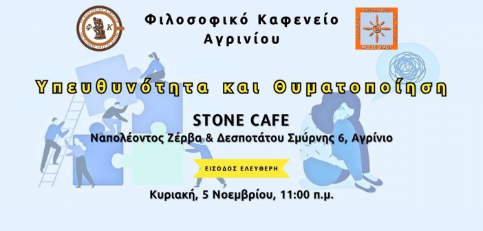 Η επόμενη συνάντηση του Φιλοσοφικού Καφενείου Αγρινίου θα πραγματοποιηθεί την Κυριακή, 05/11/23 (11.00-13.00), με θέμα συζήτησης: “Υπευθυνότητα και θυματοποίηση”, στον όμορφο χώρο του Stone Cafe, στην οδό Ναπολέοντος Ζέρβα & Δεσποτάτου Σμύρνης 6, στο κέντρο του Αγρινίου…