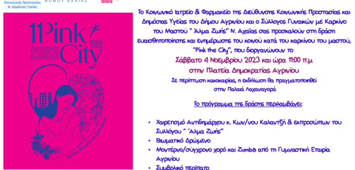 Το Κοινωνικό Ιατρείο και Φαρμακείο της Διεύθυνσης Κοινωνικής Προστασίας και Δημόσιας Υγείας του Δήμου Αγρινίου και ο Σύλλογος Γυναικών με Καρκίνο του Μαστού «Άλμα Ζωής Ν. Αχαΐας» διοργανώνουν για 4η συνεχόμενη χρονιά τη δράση “Pink the City”….