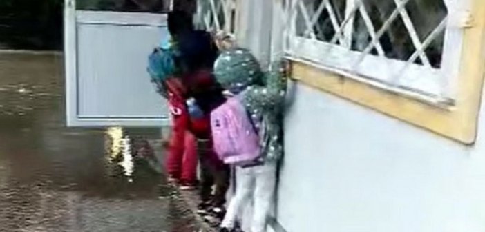 Αποτέλεσμα αυτού ήταν τα νήπια να προσπαθούν με…ακροβατικά να μπουν στο σχολείο λόγω νεροποντής. ενώ γονείς και οι εκπαιδευτικοί πήραν τα παιδιά στα χέρια για να μπουν στις αίθουσες….