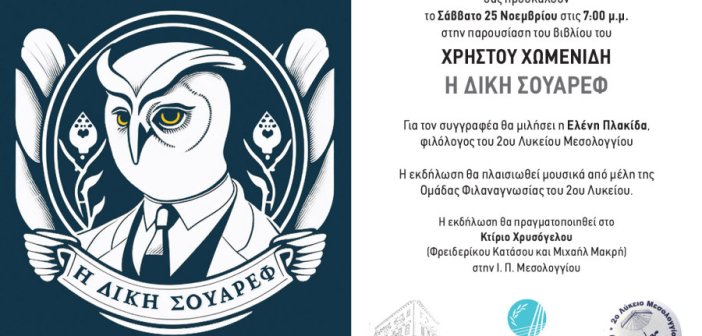 Συνεχίστε την ανάγνωση του άρθρου: Μεσολόγγι: Η παρουσίαση του νέου μυθιστορήματος του Χρήστου Χωμενίδη με τίτλο «Η ΔΙΚΗ ΣΟΥΑΡΕΦ»