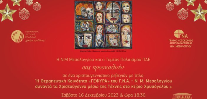 Ο Τομέας Πολιτισμού ΠΔΕ και η Ν.Μ Μεσολογγίου οργανώνουν χριστουγεννιάτικο ρεβεγιόν με τίτλο: “Η Θεραπευτική Κοινότητα «ΓΕΦΥΡΑ» του Αιτωλ/νίας – Ι.Π.Μεσολογγίου συναντά μέσω της Τέχνης τα Χριστούγεννα στο Κτίριο Χρυσόγελου” το Σάββατο στις 16 Δεκεμβρίου 2023 και ώρα 18:30….