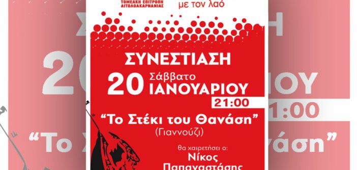 Συνεστίαση-γλέντι, με ζωντανή μουσική, διοργανώνει η Τομεακή Επιτροπή Αιτωλοακαρνανίας του ΚΚΕ, το Σάββατο 20 Ιανουαρίου, στις 9μμ, στην ταβέρνα “Το Στέκι του Θανάση” (Γιαννούζι)….