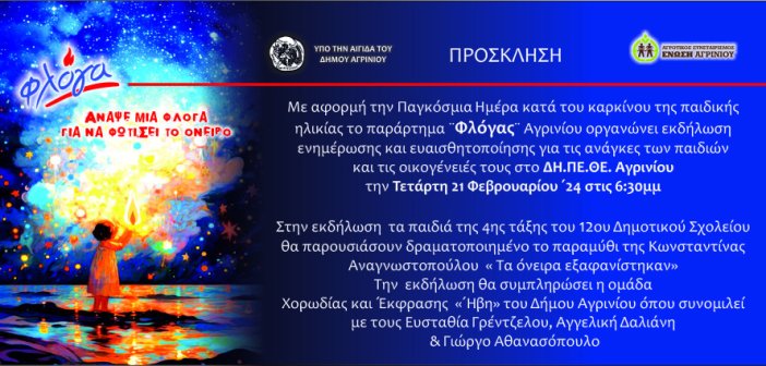 Συνεχίστε την ανάγνωση του άρθρου: “Φλόγα” Αγρινίου: Ενημερωτική εκδήλωση για την Παγκόσμια Ημέρα κατά του καρκίνου της παιδικής ηλικίας