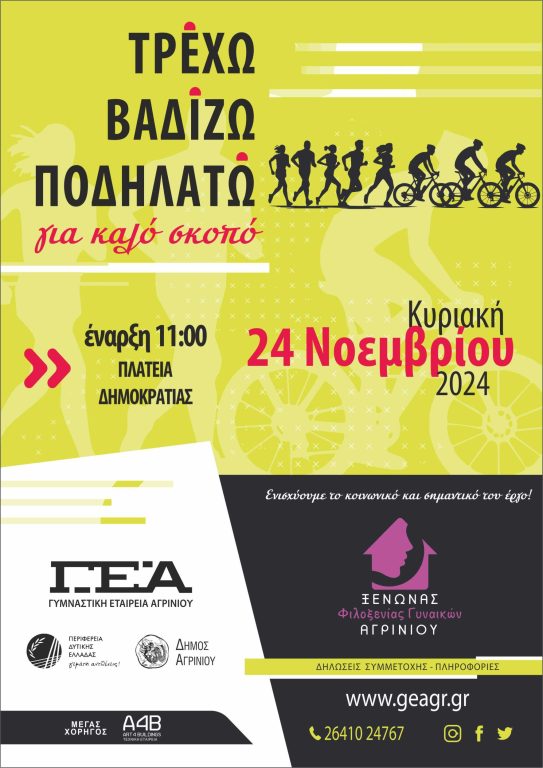 Αιτωλοακαρνανία 2024-11-06 Αγρίνιο: «Τρέχω, βαδίζω, ποδηλατώ στην πόλη μου» την Κυριακή 24 Νοεμβρίου Δυτικά FM Tην Κυριακή 24 Νοεμβρίου θα διεξαχθεί το «Τρέχω, βαδίζω, ποδηλατώ στην πόλη μου» και ήδη ξεκίνησαν οι ηλεκτρονικές δηλώσεις συμμετοχής στο www.geagr.gr/simmetoxi2024
