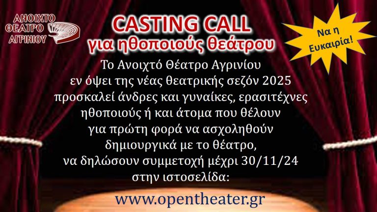 Αιτωλοακαρνανία 2024-11-22 Το Ανοιχτό Θέατρο Αγρινίου αναζητά άνδρες και γυναίκες που θέλουν να ασχοληθούν με το θέατρο Δυτικά FM Άνδρες και γυναίκες που θέλουν να ασχοληθούν με το θέατρο αναζητά το Ανοιχτό Θέατρο Αγρινίου.