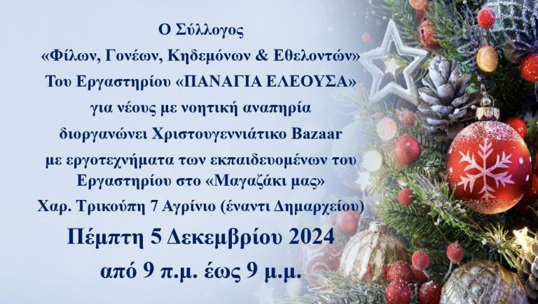 Αιτωλοακαρνανία 2024-12-05 Εργαστήρι «Παναγία Ελεούσα»: Χριστουγεννιάτικο Bazaar έξω από το Δημαρχείο Αγρινίου Δυτικά FM To Εργαστήρι «Παναγία Ελεούσα» πραγματοποιεί σήμερα Πέμπτη το Χριστουγεννιάτικο Bazaar.