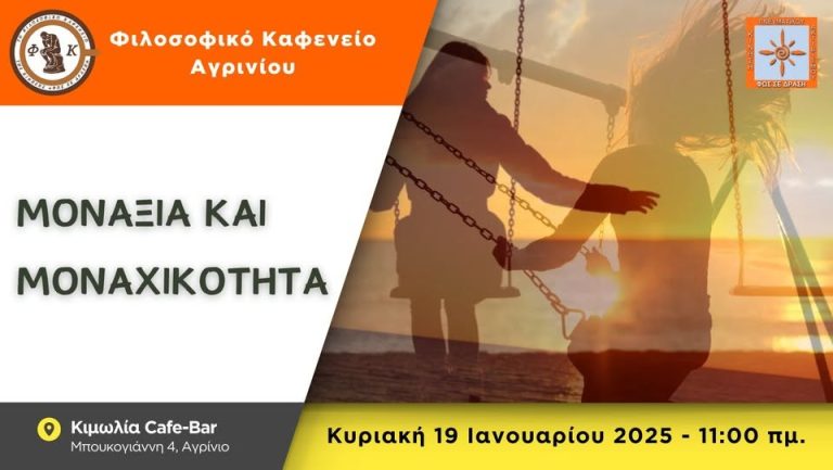 Αιτωλοακαρνανία 2025-01-15 Φιλοσοφικό Καφενείο Αγρινίου: 1η συνάντηση με θέμα “Μοναξιά και μοναχικότητα” Δυτικά FM Το Φιλοσοφικό Καφενείο Αγρινίου καλεί στην 1η συνάντηση για το 2025 με θέμα “Μοναξιά και μοναχικότητα” την Κυριακή 19/1/2025 11:00