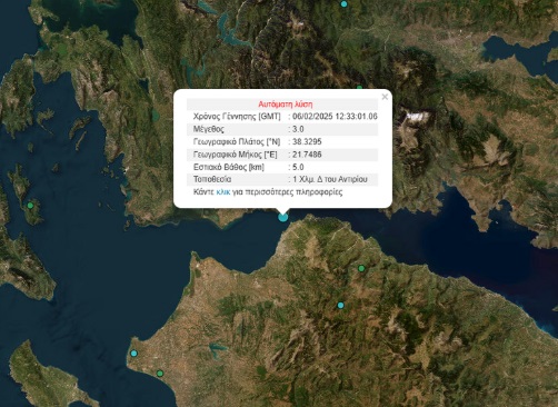 Αιτωλοακαρνανία 2025-02-06 Σεισμός 3 ρίχτερ στο Αντίρριο – Αισθητός και στην Πάτρα Δυτικά FM Σεισμός στo Αντίρριο 3 ρίχτερ, ο οποίος έγινε αισθητός και στην Πάτρα