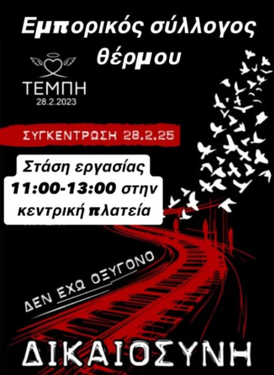 Κοινωνικά 2025-02-26 Εμπορικός Σύλλογος Θέρμου: Στάση εργασίας στις 28/2 για τα Τέμπη – Συγκέντρωση στην κεντρική πλατεία Δυτικά FM Στάση εργασίας ως ένδειξη διαμαρτυρίας και μνήμης για τα Τέμπη ανακοίνωσε ο Εμπορικός Σύλλογος Θέρμου, καλώντας σε συγκέντρωση στην κεντρική πλατεία.
