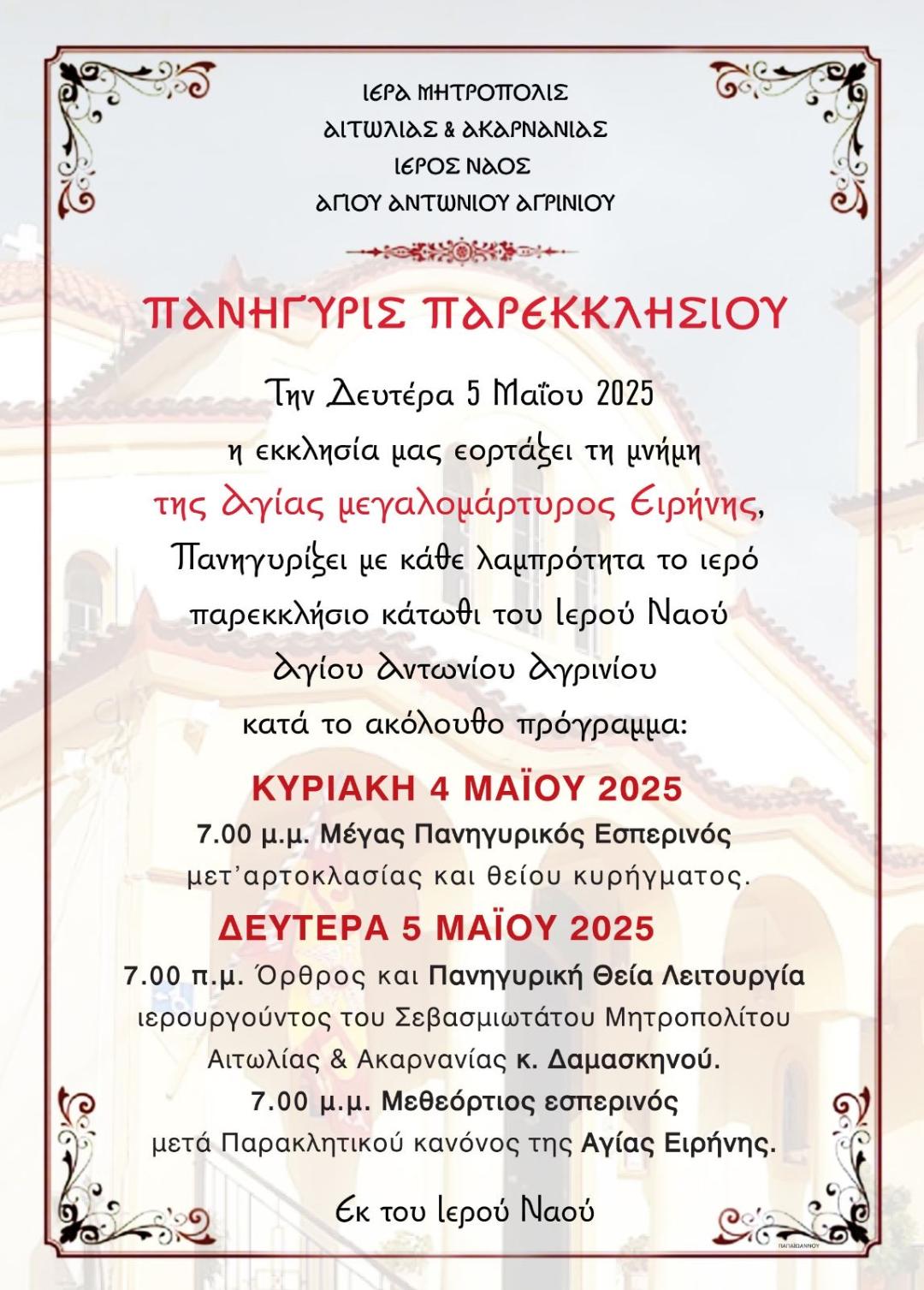 Την Δευτέρα 5 Μαΐου 2025 μνήμη της Αγίας Μεγαλομάρτυρος Ειρήνης, πανηγυρίζει το Ιερόν Παρεκκλήσιον της Αγίας Ειρήνης που βρίσκεται κάτωθι του Ιερού Ναού Αγίου Αντωνίου Αγρινίου, σύμφωνα με το ακόλουθο πρόγραμμα Ιερών Ακολουθιών: