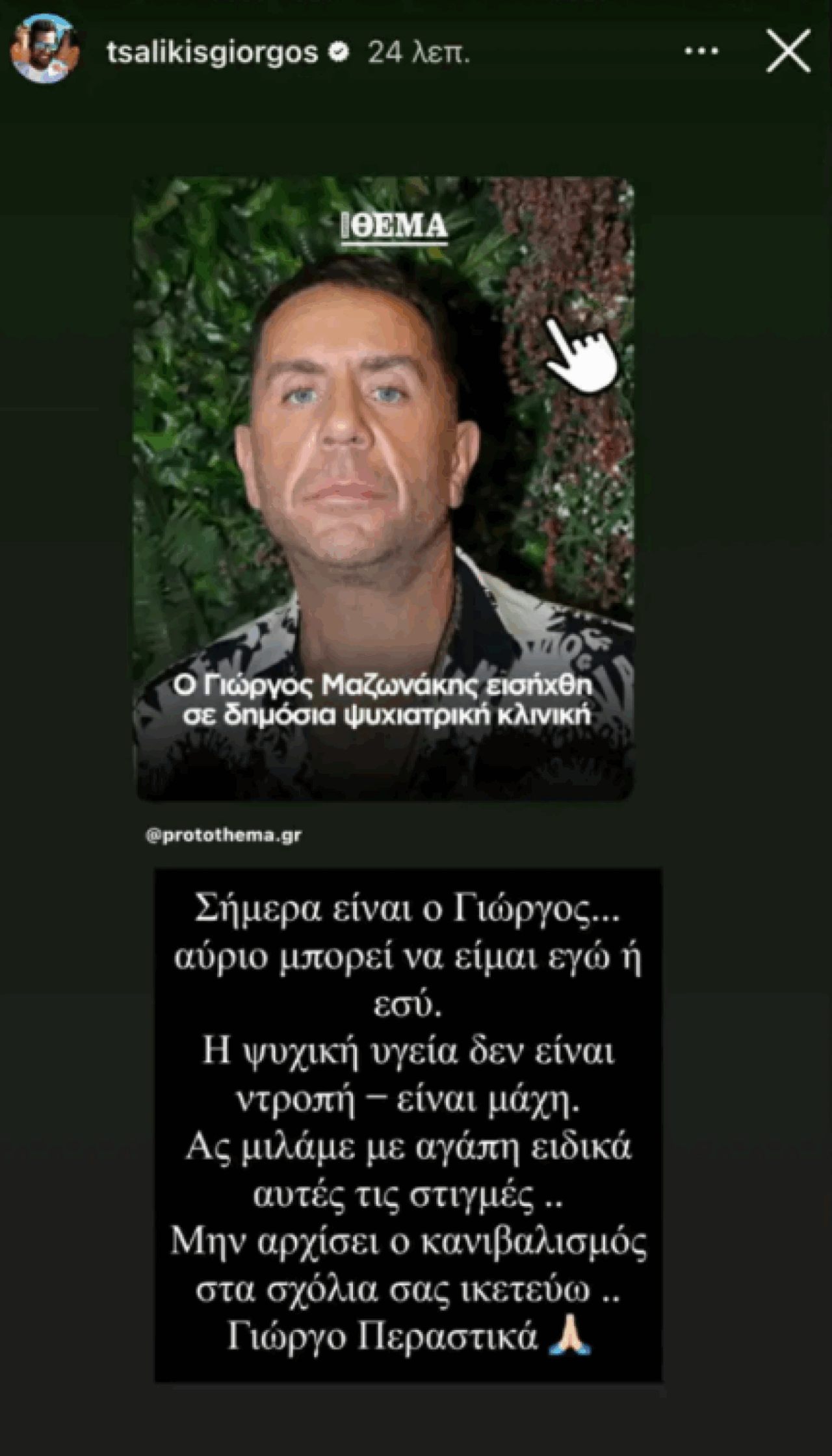 Τη στήριξή του στον Γιώργο Μαζωνάκη έδειξε ο Γιώργος Τσαλίκης, μετά την εισαγωγή του τραγουδιστή σήμερα, Πέμπτη 14 Αυγούστου, σε δημόσια ψυχιατρική κλινική.