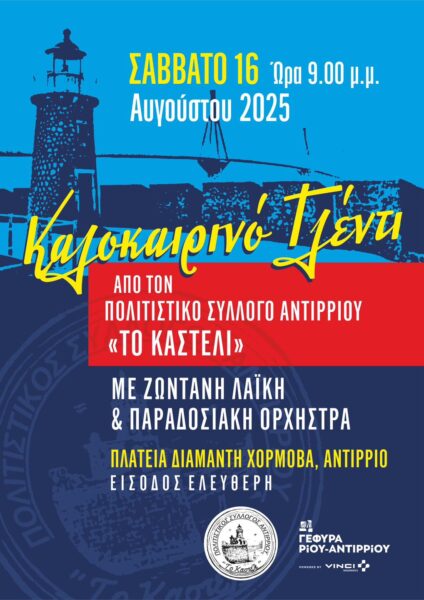 Καλοκαιρινό Γλέντι στο Αντίρριο σήμερα Σάββατο 16 Αυγούστου 2025 Ώρα 9:00 μ.μ. με το “Καστέλι”