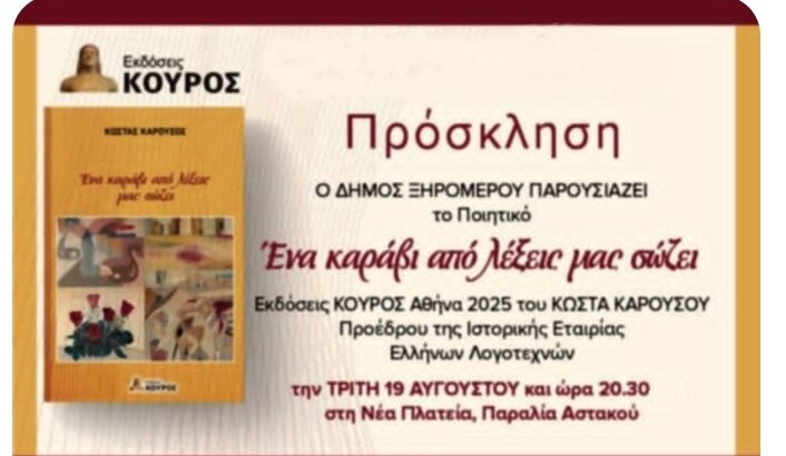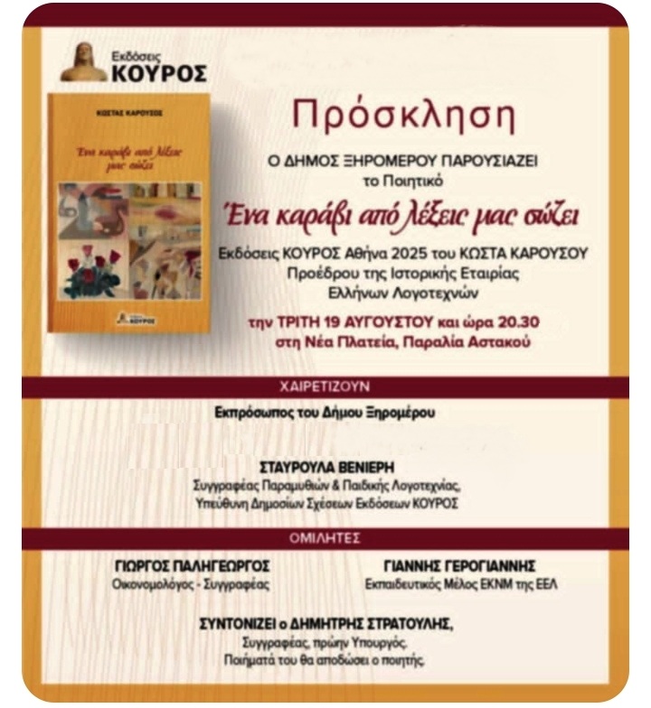 Ο ΔΗΜΟΣ ΞΗΡΟΜΕΡΟΥ ΠΑΡΟΥΣΙΑΖΕΙ το Ποιητικό: «Ένα καράβι από λέξεις μας σώζει». Εκδόσεις ΚΟΥΡΟΣ Αθήνα 2025 του ΚΩΣΤΑ ΚΑΡΟΥΣΟΥ, Προέδρου της Ιστορικής Εταιρίας Ελλήνων Λογοτεχνών την ΤΡΙΤΗ 19 ΑΥΓΟΥΣΤΟΥ και ώρα 20.30 στη Νέα Πλατεία, Παραλία Αστακού.
