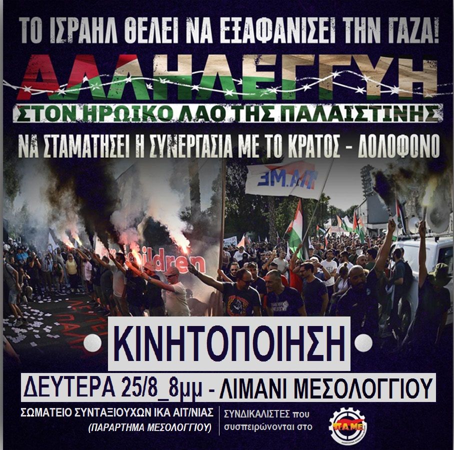 Η Λαϊκή Συσπείρωση Μεσολογγίου συμμετέχει και καλεί σε μαζική συμμετοχή στην κινητοποίηση αλληλεγγύης στον Ηρωικό λαό της Παλαιστίνης την Δευτέρα 25/8 στις 8:00 μμ στο Λιμάνι του Μεσολογγίου που οργανώνει το παράρτημα Μεσολογγίου του Σωματείου Συνταξιούχων ΙΚΑ Αιτωλ/νιας και Συνδικαλιστές που συσπειρώνονται στο ΠΑΜΕ καταγγέλλοντας την έναρξη της νέας δολοφονικής επιχείρησης του κράτους-δολοφόνου του Ισραήλ όπου ετοιμάζεται να αποτελειώσει τη γενοκτονία του Παλαιστινιακού με τον πιο φρικιαστικό τρόπο.