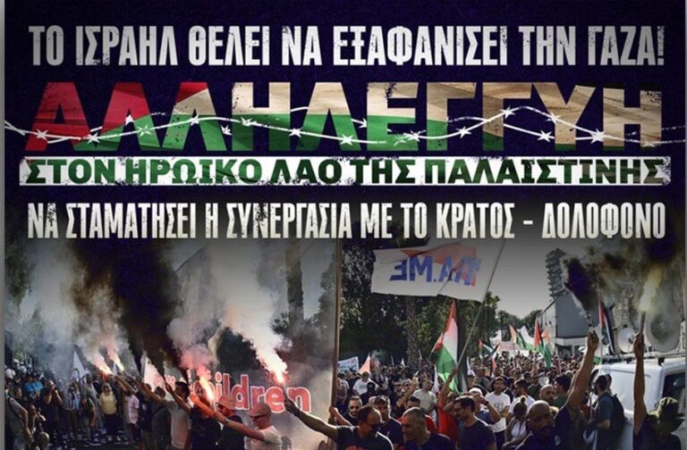 Η κυβέρνηση της ΝΔ συνεχίζει τη στήριξη στο κράτος-δολοφόνο, συμμετέχει ενεργά μέσω του σχεδίου “Aspides”, συνεχίζει την οικονομική – πολιτική και στρατιωτική συνεργασία με το κράτος του Ισραήλ.