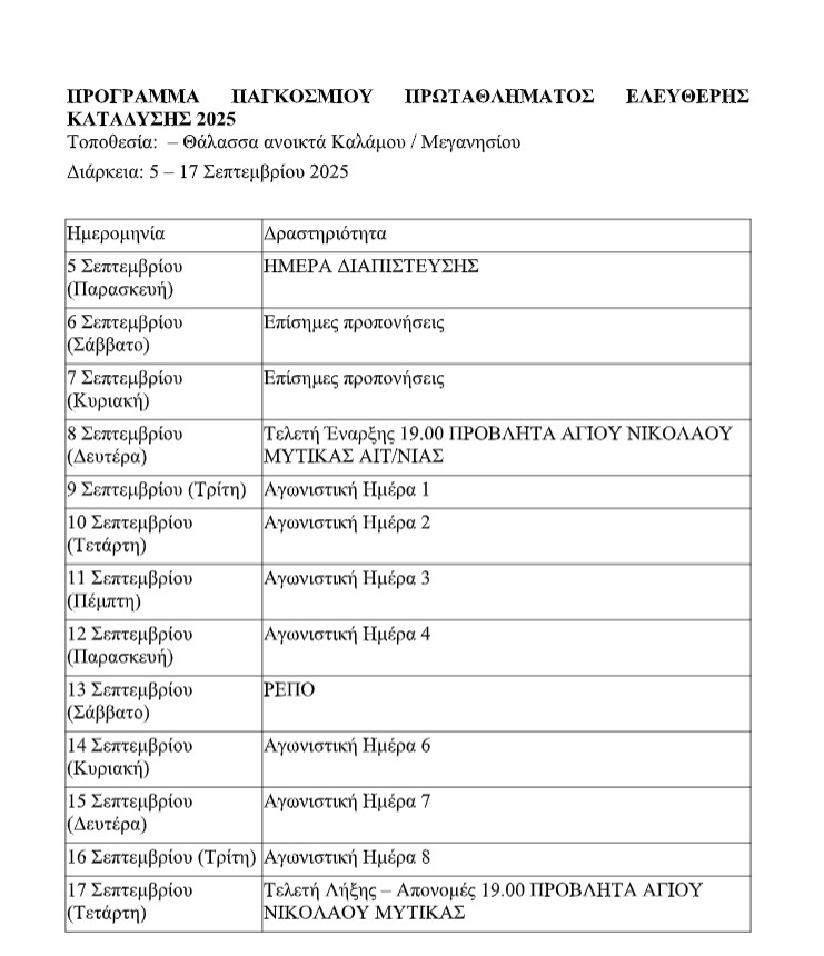 Η τελετή έναρξης του Παγκόσμιου Πρωταθλήματος Ελεύθερης Κατάδυσης Βάθους θα πραγματοποιηθεί στον Μύτικα Αιτωλοακαρνανίας τη Δευτέρα 8 Σεπτεμβρίου.