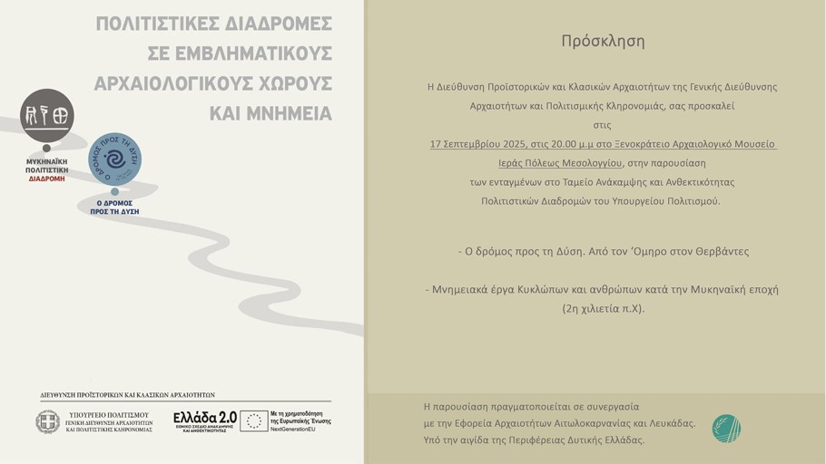 Η παρουσίαση πραγματοποιείται σε συνεργασία με την Εφορεία Αρχαιοτήτων Αιτωλοακαρνανίας και Λευκάδος και υπό την αιγίδα της Περιφέρειας Δυτικής Ελλάδος.