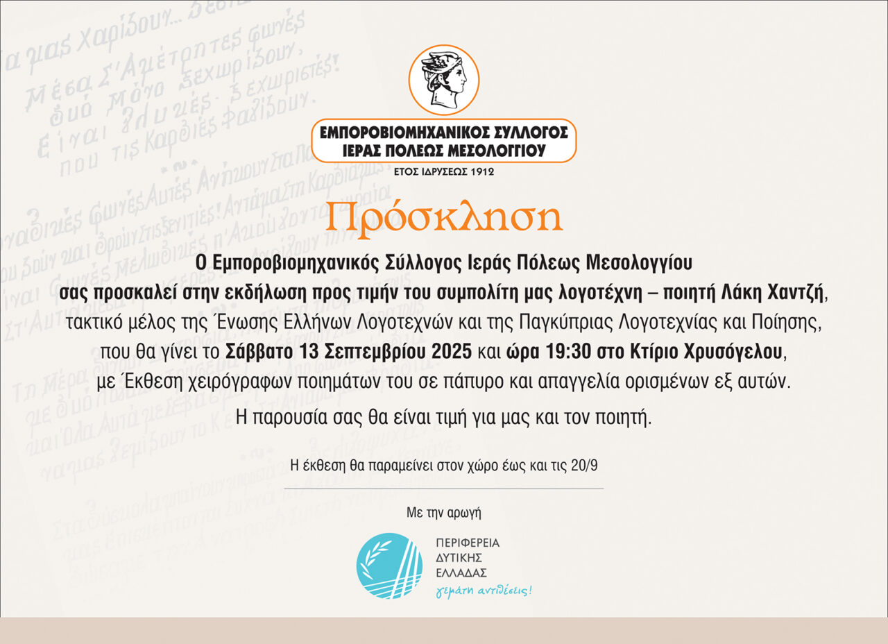 Η Διοίκηση του Εμποροβιομηχανικού Συλλόγου Μεσολογγίου σας προσκαλεί σε εκδήλωση που διοργανώνει το Σάββατο, 13 Σεπτεμβρίου και ώρα 19:30 στο Κτίριο Χρυσόγελου, για να τιμήσει τον συμπολίτη μας λογοτέχνη – ποιητή Λάκη Χαντζή, τακτικό μέλος της Ένωσης Ελλήνων Λογοτεχνών και της Παγκύπριας Λογοτεχνίας και Ποίησης.