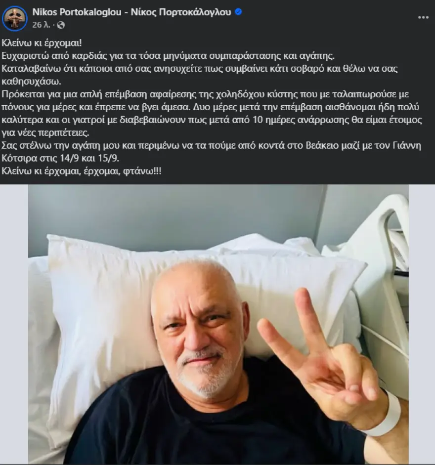 «Κλείνω κι έρχομαι! Ευχαριστώ από καρδιάς για τα τόσα μηνύματα συμπαράστασης και αγάπης. Καταλαβαίνω ότι κάποιοι από σας ανησυχείτε πως συμβαίνει κάτι σοβαρό και θέλω να σας καθησυχάσω. Πρόκειται για μια απλή επέμβαση αφαίρεσης της χοληδόχου κύστης που με ταλαιπωρούσε με πόνους για μέρες και έπρεπε να βγει άμεσα. Δυο μέρες μετά την επέμβαση αισθάνομαι ήδη πολύ καλύτερα και οι γιατροί με διαβεβαιώνουν πως μετά από 10 ημέρες ανάρρωσης θα είμαι έτοιμος για νέες περιπέτειες», έγραψε ο Νίκος Πορτοκάλογλου.