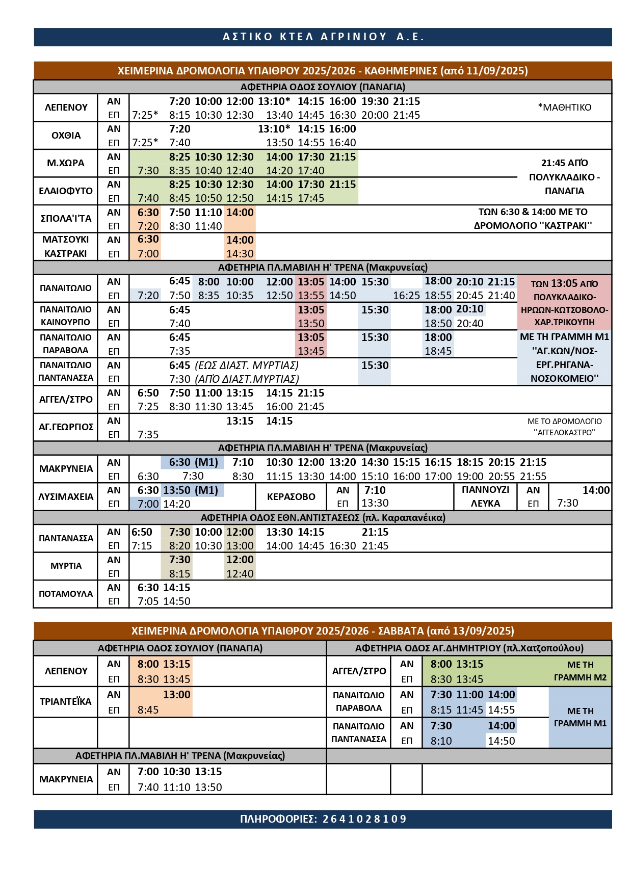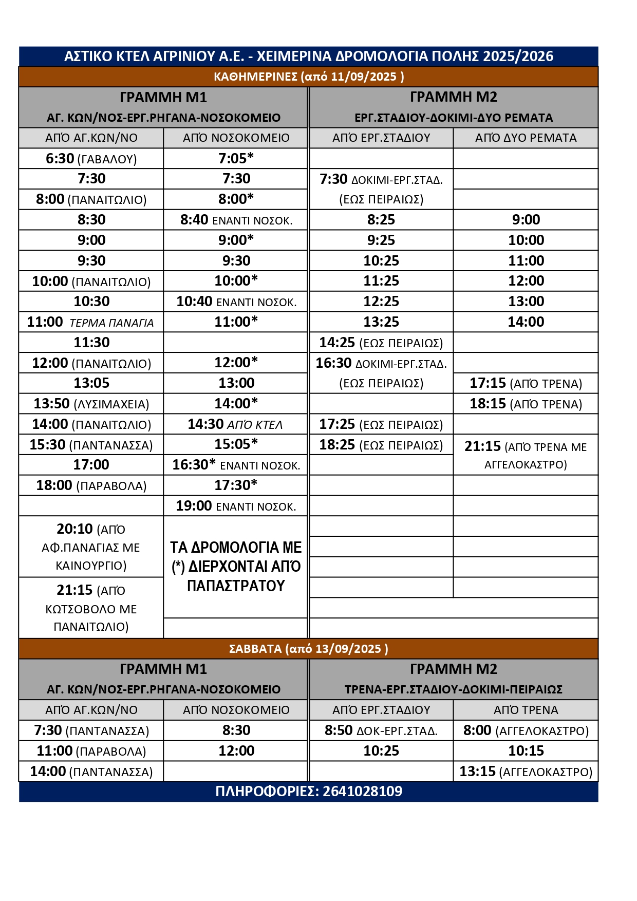 Το Αστικό ΚΤΕΛ Αγρινίου ενημερώνει το επιβατικό κοινό για τα νέα χειμερινά δρομολόγια που θα ισχύουν για τους χειμερινούς μήνες.