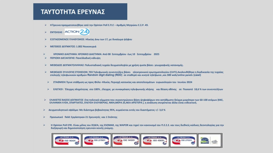 Στην εκτίμηση ψήφου η ΝΔ καταγράφεται στο 30,5% επιστρέφοντας στα επίπεδα του Μαΐου και του Ιανουαρίου του 2025, δηλαδή 2,5 μονάδες πάνω από το αποτέλεσμα των ευρωεκλογών , με το ΠΑΣΟΚ να ακολουθεί με 14% (με οριακή άνοδο 0,1 της μονάδας σε σχέση με την έρευνα Ιουλίου της εταιρείας) , την Πλεύση Ελευθερίας με 11,7%, την Ελληνική Λύση με 11,5%, το ΚΚΕ 7,4%, η Φωνή Λογικής 4,3%, ο ΣΥΡΙΖΑ 4,2%, το ΜΕΡΑ25 3,4%, το Κίνημα Δημοκρατίας 2,7%, η Νίκη 2,4%, η Νέα Αριστερά 1,6% και οι Σπαρτιάτες με 1,3%. Ενδιαφέρον παρουσιάζει το γεγονός ότι στην πρόθεση ψήφου, ένας στους τέσσερις ψηφοφόρους αυτοτοποθετείται στην «γκρίζα ζώνη».