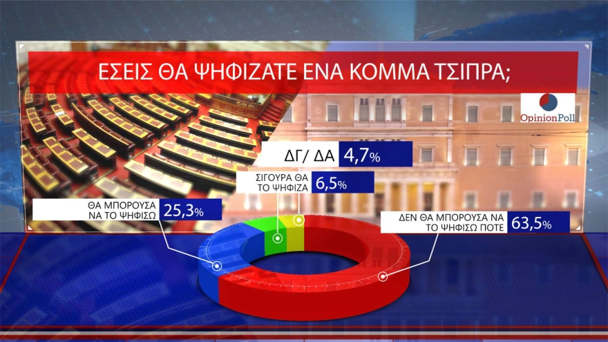 Στην ίδια μέτρηση, το 63,5% των πολιτών βλέπουν αρνητικά ή μάλλον αρνητικά την ανάληψη πρωτοβουλίας για ίδρυση νέου κόμματος από τον Αλέξη Τσίπρα. Μάλιστα την ίδια άποψη έχει το 44,3% των αριστερών ψηφοφόρων και το 41,3% των κεντροαριστερών. Το ίδιο ποσοστό δηλώνει ότι δεν θα το ψήφιζε ποτέ, με μόλις το 6,5% να απαντά ότι θα το ψήφιζε σίγουρα.